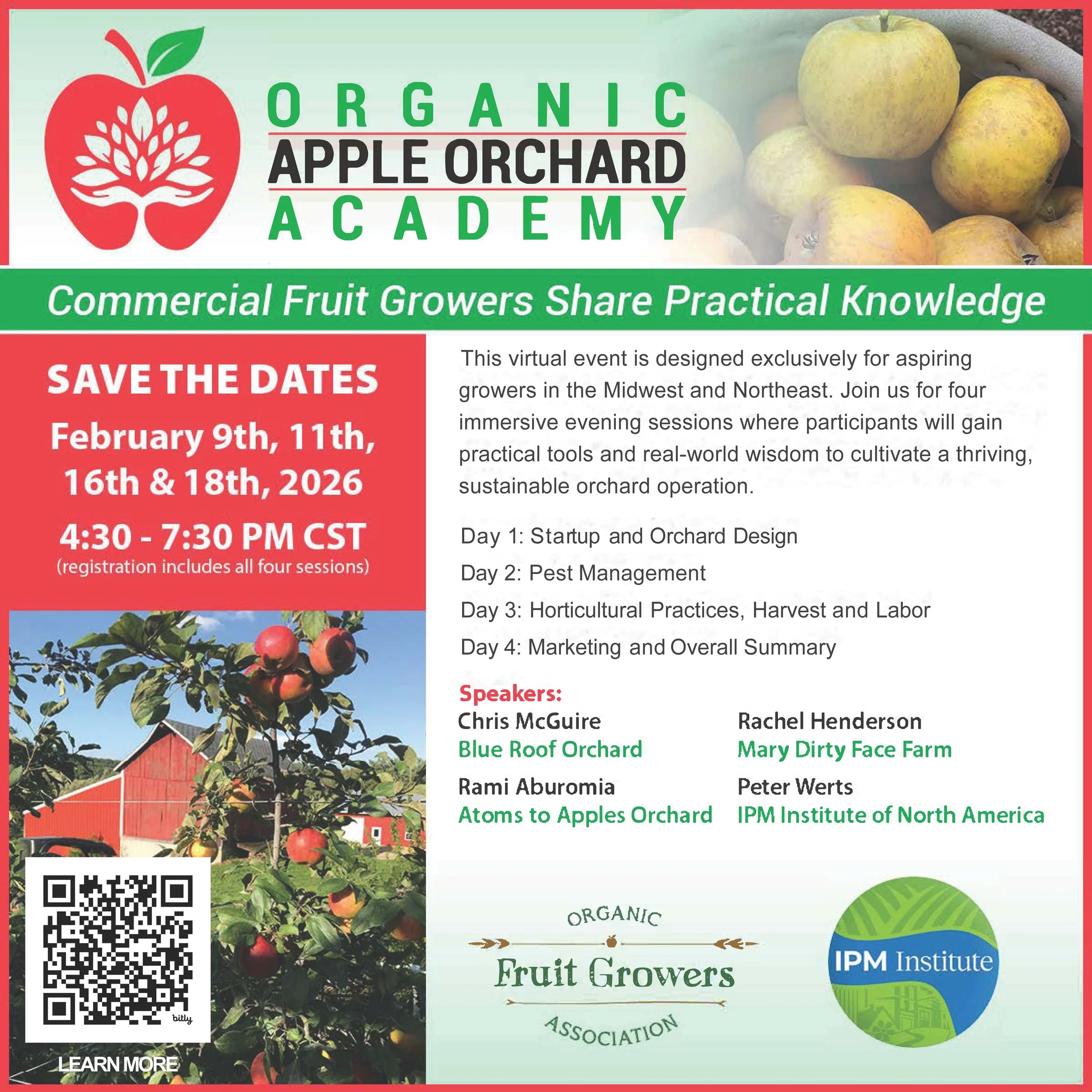 Join us for four immersive evening sessions on February 9, 11, 16, and 18, 2026, from 4:30 to 7:30 PM Central Time, to gain the practical tools and real-world wisdom to cultivate a thriving, sustainable orchard operation.